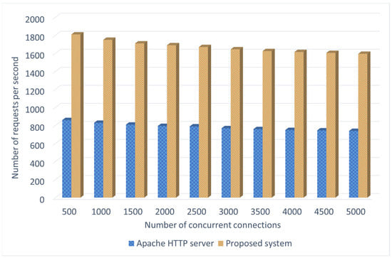 In the experiment of firmware downloading, we measure the number of requests per second that the proposed system can handle when concurrent IoT devices execute the downloading procedure. As long as IoT devices sends the firmware updating query to the blockchain node, the smart contract will handle this request. It checks whether the system has a new version of firmware and then sends the downloading link to the IoT device. In this evaluation, the ApacheBench benchmarking tool is used to simulate the requests sent from IoT devices. We compare the proposed system with an Apache HTTP (HyperText Transfer Protocol) server based on downloading the firmware update file whose size is 31.8 K. For the 31.8 K update file, the proposed system can support more than 1500 requests per second even if the number of concurrent connections gradually increases to 5000. As shown in Figure 9, it can be found that our proposed system has much better performance than the Apache HTTP server. Furthermore, the problem of single point of failure does not occur in the proposed system.