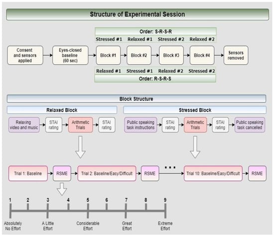 Participants first completed a one-minute eyes-closed baseline trial at the beginning of the experiment. Then, they were asked to complete four blocks of tasks alternating between a Relaxed (R) and a Stressed (S) state. Half of the participants started the experiment with a Relaxed block (i.e., block order was R1-S1-R2-S2), while the other half began the experiment with a Stressed block (i.e., block order was S1-R1-S2-R2). The Relaxed and Stressed states were induced at the beginning of each block (see Section 2.3.2 and Section 2.3.3 for state induction protocols). Each block then comprised ten trials: four eyes-open baseline trials, three “Easy” arithmetic trials (low workload), and three “Difficult” arithmetic trials (high workload). Trial order was different for each of the four blocks. In all cases, no two consecutive trials were of the same difficulty level. The structure of the experimental session is depicted in Figure 1.
