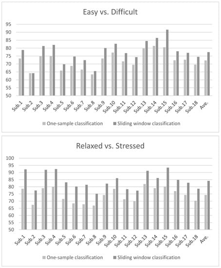 To further improve online classification accuracy by reducing incorrect predictions resulting from sudden changes in the EEG signals, we applied a sliding window classification in which the final predicted class for each sample was determined by the majority vote of the output of the InstanceEasyTL classifier (i.e., the cross-subject with TL approach) for that sample and the two previous samples. This method results in a prediction every 2 s, the same as before. Using this sliding window classification method for the cross-subject with TL paradigm, the average accuracy for the Easy vs. Difficult classification significantly increased by 5.3% to 77.5% ± 6.9 ( t 17 = 10.12 ; p < 0.001 ) and the average accuracy for the Relaxed vs. Stressed classification significantly increased by 9.9% to 84.1% ± 5.9 ( t 17 = 16.98 ; p < 0.001 ) over all subjects. Figure 3 shows the classification accuracies using one-sample prediction as compared to the sliding window classification for all subjects.