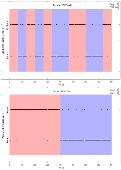 Figure 4. Simulated online output of the system for Subject 15 for both the Easy vs. Difficult and Relaxed vs. Stressed classification problems. After training the classifier on the first two blocks of data (combined with the data from all other subjects), consecutive samples from the final two blocks were classified (epochs were of length 4 s, with 2 s overlap). Classification was performed using the cross-subject with TL approach, with a sliding window classification over three samples. The shaded intervals indicate the actual mental state, while the black dots indicate the predicted state.