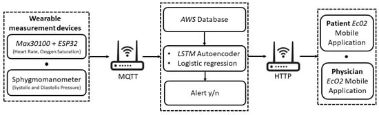 The vital monitoring and real-time anomaly detection is carried out by means of the developed AI-based algorithm. First, a Multivariate Linear Regression (MLR) algorithm is used to estimate the value of SP and DP, starting from the HR and SpO2 values coming from the MAX30100 and taking into account the age and the presence of diabetes for each patient. The MLR was chosen since it is one of the most consolidated approaches adopted at the state of the art [36,37,38]. However, other algorithms based on Support Vector Machine, Support Vector Regression [39] and Regression Tree [40] can also be suitably used to estimate systolic and diastolic pressure values. Then, an LSTM Autoencoder is implemented to process the entire set of obtained data (HR, SpO2, SP, DP).
