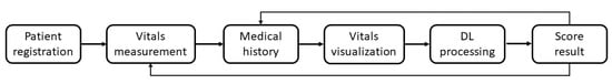 - The data on the cloud are processed by means of a DL algorithm, which is trained on the basis of preliminary measurements of the patient vitals.