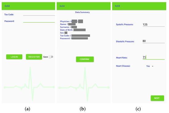 Figure 4. Window of the EcO2u mobile application: Main menu of the application (a); Patient registration (sensitive data are hidden) (b); Data calibration (c). - Vitals measurement: To allow the successive automated estimation of the systolic and diastolic pressure, a preliminary calibration procedure has to be carried out. In particular, the patient uses a sphygmomanometer to measure the systolic and diastolic pressure values, while the wearable sensing platform sensor is measuring HR and SpO2. Then, the patient manually enters these data in the application (Figure 4c). This phase, which has to be carried out only once, is necessary to identify the parameters that will subsequently allow the soft transducer to estimate the pressure. After the calibration, the patient can start using the soft transducer.The mobile application was also endowed with an important identification feature that allows associating (and later verify) the patient’s identity acquired through the smartphone camera, as shown in Figure 5a. Finally, the monitored vitals are displayed to the patient, as shown in Figure 5b.