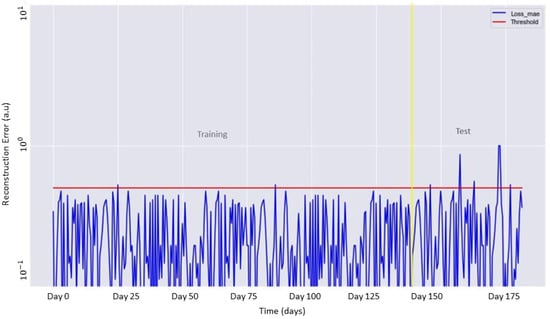 As mentioned in Section 4.3, the training of the LSTM Autoencoder was carried out for 100 epochs and allowed the identification of the appropriate threshold value. Figure 6 shows the behavior of the Autoencoder on the complete dataset, including the data used for training and testing. These data were indexed day by day. As shown, during the observation period, the score of the reconstruction error occasionally exceeded the threshold value, indicating an anomaly in the measured data.