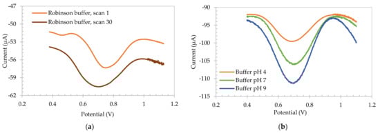 Table 1 summarizes the data obtained from each calibration plot, excluding IUPAC buffers. The pH was accurately calculated in all the solutions, demonstrating the ability of a flavanone/SA voltammetric-based sensor to monitor pH medias well known to be troublesome for the traditional glass electrode such as high viscosity solution, low buffered, low ionic strength, hydroponics, and cell-culture media.
