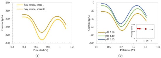 Square wave voltammograms for (a) scan 1 and scan 30 of SA electrode electropolymerized in soy sauce. (b) SA electrodes in soy sauce over different pH values, and calibration plot obtained in soy sauce and IUPAC standard buffers inserted.