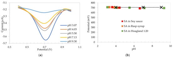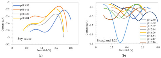 The SA electrode was then tested in 1:20 diluted Hoagland solution. It was first abraded, removing the polymer formed on the surface of the electrode. SA was then polymerized directly in Hoagland solution (pH 7.17). The pH was then adjusted by adding 0.5 M NaOH and 0.5 M HCl stock solution additions providing a pH range from 3.07 to 9.30. Well defined square wave voltammograms were obtained, as shown in Figure 3a in all solutions. The resulting plot of peak potential as a function of pH for the SA-based electrodes in diluted Hoagland solution overlayed the ones for raspberry syrup, soy sauce and IUPAC standard buffers, as detailed in Figure 3b. The sensitivity obtained for Hoagland solution was −2.44 mV/pH unit, confirming the ability of the electrode to control the pH local to the electrode surface. These data thereby confirm the purpose of using SA-based carbon electrodes as a reference electrode in high viscosity food media as well as in hydroponic solutions with very low conductivity. The average peak potential of the SA electrodes in a range of pH 2.83–9.30 for both medias was 701.9 ± 7.2 mV.