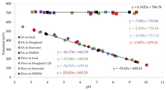 With the aim of using SA electrode as a reference system, the electrochemical response of the flavanone-based pH sensing electrodes was then tested using square wave voltammetry in the same medias, and the calibration plot obtained is also presented in Figure 4, showing a pH sensitive behavior. The flavanone electrode was first electropolymerized in the food media as outlined previously [19]. In this case a reductive wave was observed at +0.465 V for scan 1 which was shifted to +0.440 V on consecutive scans and stabilized after 5 scans (not shown). As with SA electrodes, pH was adjusted in each solution to study the behavior of the electrode for different pH in each media. Figure 5 presents the redox waves for each solution. It can be clearly observed that the peak potential shifts to lower potentials as the pH of the solution increases. Black trendline in Figure 4 (circles) shows the buffer calibration of Flavanone electrodes, with a sensitivity of −55.7 mV/pH. A linear plot of peak potential with pH was observed in all the different conditions, overlaying the buffer calibration trendline with a sensitivity of −46.2 mV/pH, −53.6 mV/pH unit, −54.8 mV/pH unit and −55.8 mV/pH unit for food media, Hoagland hydroponic solution, seawater/CO2 system and DMEM bio-based media, respectively. The resulting polymer was found to provide a Nernstian response in high/low buffered, low conductivity, high viscosity, and cell-culture medias.