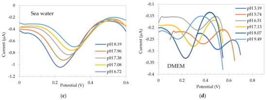 Square wave voltammograms for Flavanone-based electrodes in pH adjusted (a) soy sauce, (b) 1:20 diluted Hoagland solution, (c) sea water, and (d) DMEM.