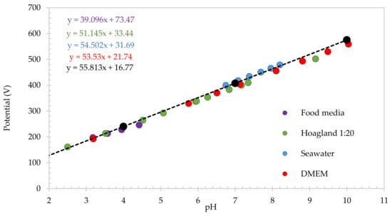 In order to prove the adaptability of the SA electrode as a pH insensitive sensor in different conditions, the electrode was tested in synthetic sea water, and in DMEM high buffered bio-based solution. In this case, the electrode was abraded again to ensure a fresh, unpolymerized SA surface, and electropolymerized in Britton–Robinson for 30 scans (not shown) prior to each test. Once polymerized, SA electrode was tested in sea water, with additions of different CO2 concentrations for adjusting the required pH. The pH measured by the glass pH probe ranged 8.20 to 6.51. Additions of NaOH 0.5 M and HCl 0.5 M stock solutions were added to DMEM to adjust the pH across the range from pH 6.66 to pH 9.42. The results obtained for the calibration plot of SA electrodes in seawater/CO2 system and DMEM solutions overlayed the previous food media and hydroponic solutions, with an average peak potential of +709.2 ± 0.4 mV and +699.3 ± 6.4 mV, subsequently, as shown in Figure 4. The sensitivities exhibited in these two medias were −0.25 mV/pH unit for seawater and +2.50 mV/pH unit for DMEM. Sensitivity being very close to zero confirms the purpose of using salicylic acid carbon-based electrode as a reference electrode in low buffered systems, indicating the ability of the chemistry to control the environmental local pH of the electrode surface, due to the acid concentration of the surface.