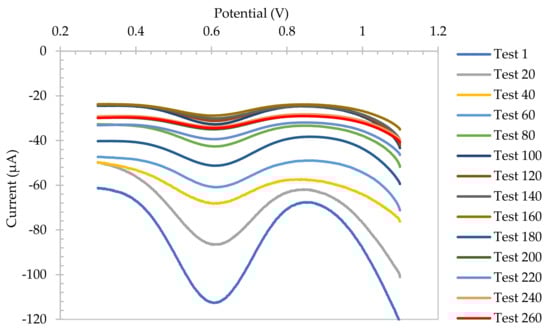 Square wave voltammograms of SA electrode every 20 tests, scanned every half an hour over 10 days, with a total of 260 tests.