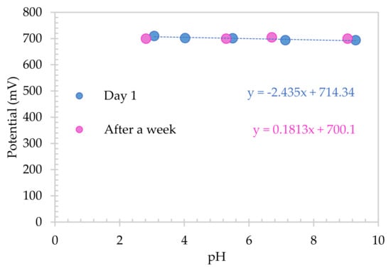 Long term experiments in Hoagland 1:20 diluted were also carried out. SA electrode was first abraded to ensure an unpolymerized surface and polymerized in Britton–Robinson solution. It was then stored in Hoagland x20 solution over a week, in order to study the influence of the solution in the calibration plot. The storage condition did not affect the chemistry of the electrode, as Figure 8 presents. A sensitivity of 0.18 mV/pH unit as recorded after day 5 with the calibration plot overlaying that obtained on day 1. The SA electrode was immersed and scanned every hour over 37 days, with a total of 5000 scans showing the long-term stability of the electrode in these media.