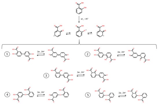 This result is consistent with the literature data which shows that oxidation of the SA monomer in acidic conditions produces a polymeric species on the electrode surface. Although the SA oxidation products have not been clearly identified, it is believed the oxidation is similar to that of phenol, as demonstrated by Park et al. [28] (Scheme 1). In this process it is shown that long chains of electropolymerized SA are difficult to obtain, rather the electrode is coated with short chained polymeric species. Indeed Scheme 1 shows the formation of three different radicals, forming some dimers after propagation, with a further oxidation of SA products. However, some trimers may also be formed during electropolymerization as well. Park et al. suggested that the electrochemical oxidation of SA can be impacted by intermolecular H-bonds formed by the carboxyl group, and intramolecular H-bonds with the closest phenolic functional group, C=O···HO. The electrochemical reaction of the electrode when submerged in a solution is based on the hydrogen bonding formed by the hydrogen of the acid group, forming carboxylate anions on the surface of the electrode. The carboxylate anion is stabilized by intramolecular hydrogen bonding with the adjacent phenolic group [29].