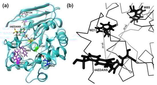 In silico representation of the 3D structure of the EST2-S35C: (a) ribbon representation showing in stick form: the catalytic triad Ser155 (green), Asp252 (blue) and His282 (red); the fluorescent probe IAEDANS; the tryptophan residues (magenta); (b) representation focusing on a part of the EST2-S35C backbone, highlighting the distance between the tryptophan residues 85 and 213.