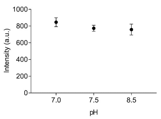 The stability of labelled EST2-S35C at different pH values was tested in the range from 7.0 to 8.5, which covers important liquid samples such as blood (pH 7.4) and drinking water (pH 7.0). We used two buffers with different properties. In particular, Tris/HCl is a widely used buffer suitable for the solubilisation of molecules with organic properties, while the inorganic NaH2PO4 is more appropriate for ion solubilisation. No significant differences (F(2,6) = 2.36, p = 0.18, R2 = 0.44) were observed when applying FRET for measuring the fluorescence intensity of 67 nM labelled EST2-S35C (Figure 3). The pH is one of the major factors that can imply changes in enzyme conformations, impairing their activity. These results are not surprising, since EST2 is known to tolerate a certain range of pH fluctuations without compromising its activity []. However, due to the moderate to extremely acidic nature of fruit juices, any measurements of these samples must be performed in a buffered solution.