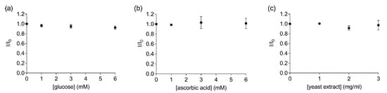 Ratios of the fluorescent intensity (mean ± SD, n = 3) of 67 nM labelled EST2-S35C at the maximum of emission (457–461) in the presence (I) and the absence (I0) of different concentrations of the tested substances: (a) glucose (mM); (b) ascorbic acid (mM); (c) yeast extract (mg/mL).
