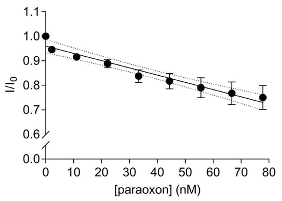 Ratios of the fluorescence intensity (mean ± SD, n = 3) of 67 nM IAEDANS-labelled EST2-S35C in the presence (I) and the absence (I0) of increasing concentrations (nM) of paraoxon at a maximum wavelength of emission of 458–460 nm. Dotted lines represent the 95% confidence interval for the linear regression.