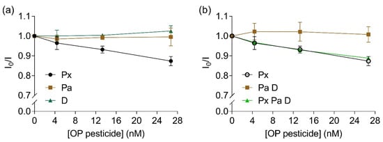 Ratios between the fluorescent intensity (mean ± SD, n = 3) of 67 nM IAEDANS-labelled EST2-S35C in the presence (I) and the absence (I0) of increased concentrations (nM) of: (a) individual OPs paraoxon (Px, maximum of emission 458–462 nm), parathion (Pa, maximum of emission 452–462 nm) and diazinon (D, maximum of emission 451–462 nm); (b) paraoxon (repeated for comparison purposes), mixture of 1:1 parathion:diazinon (maximum of emission 458.5–462.5 nm) and mixture of 1:1:1 paraoxon:parathion:diazinon (maximum of emission 459–462.5 nm).
