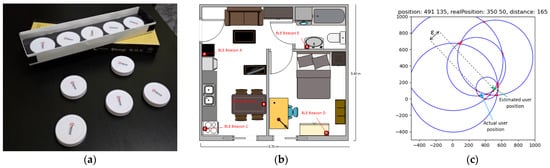 (a) Bluetooth beacons used in our experiments; (b) apartment map with beacon locations; (c) example result of the position inference method in [18].