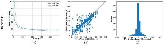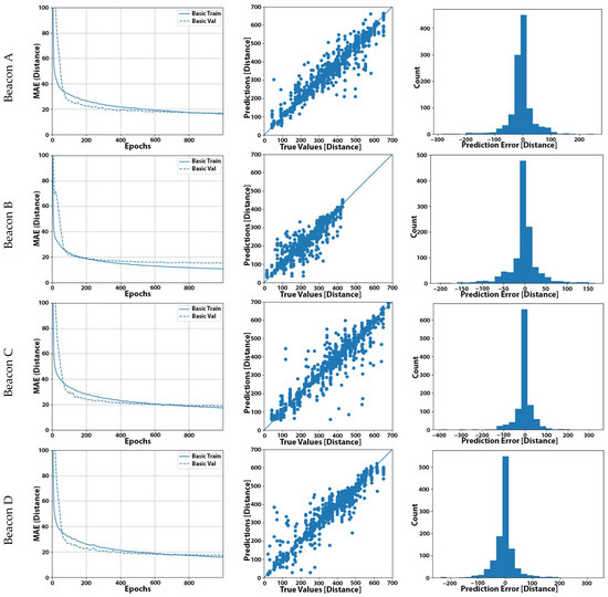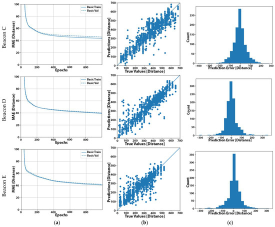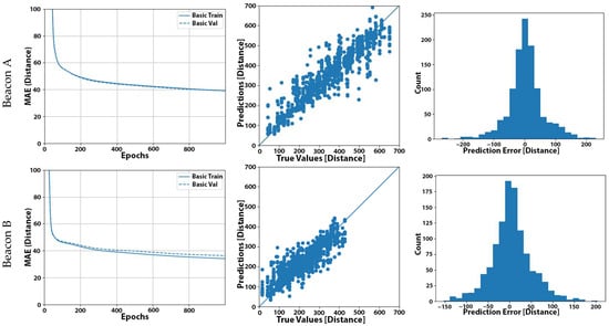 First, we normalized our data to make training more efficient. We used the Rectified Linear Unit (ReLU) activation function for all hidden layers. It is the default activation function for many types of neural networks, because a model that uses it is easier to train and often achieves better performance [27]. For the single-neuron output layer, we used the Linear Activation (LA) function. Another important task is the selection of the loss function. The mean squared error (MSE) or mean absolute error (MAE) are the two most common choices. As our goal was to minimize the average error of the distances between the device and the beacons, we chose the MAE, as it penalizes outliers and is easier to interpret.