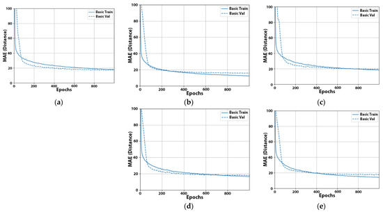 As a next step, we chose to test our hypothesis derived from our previous observations that the number of 1000 epochs for the learning process was overestimated. Thus, we conducted three experiments, keeping the same NN architecture, and repeated the learning process for the number of epochs to 500, 200, and 100 to see how this affected the predicted distance error using the resulting model. The results are displayed in Table 3. As we can observe, the selection of 500 epochs in experiment No. 1 yielded the minimum MAE. Actually, experiment No. 2 yielded even slightly better results in terms of the average MAE than with the baseline configuration, supporting our hypothesis for the negative impact of overfitting in the case of assigning excessive epochs to the learning process.