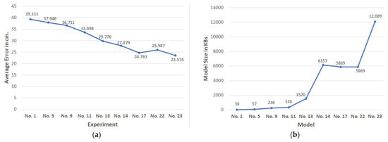Adam algorithm remained the optimized algorithm, and we trained our model for 200 epochs in all cases. From the results in Table 6, we can observe that although the more complex DNN architectures yielded a decrease in the average MAE by more than 3 cm (compared to the results of Table 5), this was not significantly affected by the number of layers after one point. Only significant increases in both the number and the size of the layers (experiment No. 16) yielded an additional improvement in the accuracy of around 2 cm.