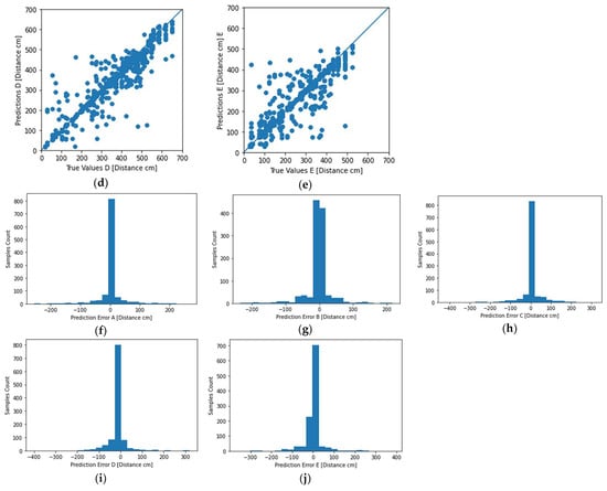 Inference scattering diagrams for nodes A (a), B (b), C (c), D (d), and E (e) (predicted distance in cm (y-axis) vs. true value (x-axis) in cm). Inference error distributions for nodes A (f), B (g), C (h), D (i), and E (j) (sample count (y-axis) vs. prediction error (x-axis) in cm).