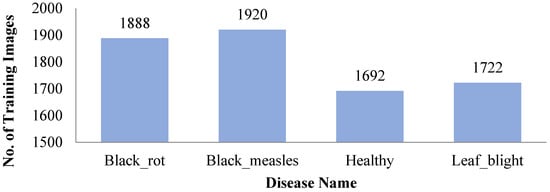 The diseases such as powdery mildew, downy mildew, rust, black rot, scab, etc., [16] are found on grape leaves. The dataset is collected from PlantVillage [33] which is composed of healthy images (2115 images), including diseased images of black rot (caused by ascomycetous fungus; 2360 images), black measles (caused by phaeomoniella aleophilum fungus; 2400 images), and leaf blight (caused by pseudocercospora Vitis fungus; 2152 images) as shown in Figure 1 below.