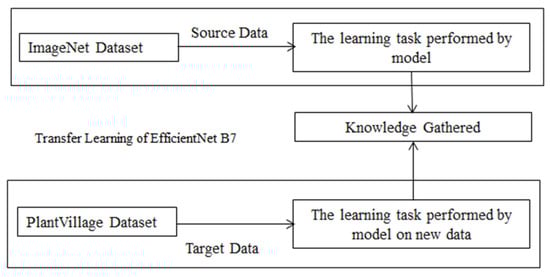 Deep learning, which is more modern, has had a major impact in a variety of fields. In the agricultural arena, gathering a large quantity of data for training of model that is new from start is difficult. The training data determines how well a system performs. With transfer learning the data get independent with this approach. It is simple to train a model from an insufficient model using transfer learning [38]. In this study, the EfficientNet B7 CNN model is used for training on the PlantVillage dataset. For the prediction of grape leaf disease this transfer learning model is used. The model is trained on raw data with resized image from 256 × 256 to 224 × 224. The model once trained on this raw data get knowledge of detecting the disease on plant leaf. The trained model then applies on grape leaf dataset for the detection and identification of leaf disease. The working of re-train model based on transfer learning is shown in Figure 6.