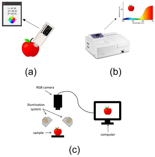 Color is described using a color space, which is a mathematical representation able to associate color coordinates with each perceived color. There are three different types of color spaces: hardware-oriented color spaces, human-oriented color spaces, and instrumental-oriented color spaces [7]. Hardware-oriented spaces are used for hardware processing, such as, e.g., image acquisition or image display on digital screens. The most popular hardware-oriented space is the RGB space, which is defined by the coordinates on the red (R), green (G), and blue (B) axes. Human-oriented spaces better reflect color perception by the human eye, as we are more prone to describe color characteristics of an object using the concepts of tint, shade, or tone rather than the amount of red, green, and blue. An example of human-oriented space is the hue (H) –saturation (S) –intensity (I) space, where the concept of hue is related to the “purity” of a defined color, saturation is related to the perception of colorfulness of an area in relation to its brightness, and intensity describes the amount of light present in a color. Instrumental spaces are used by classical instruments measuring color, such as colorimeters, and they have been standardized by the Commission Internationale d’Eclairage (CIE) in order to have device-independent color coordinates. In color measurement of food products, the most used color space is the L*a*b* color space (also known as CIELAB).
