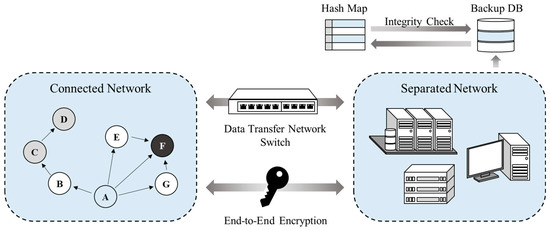 Network separation refers to the logical and physical separation of a business network from an external Internet network, designed to prevent external attacks by blocking the Internet connection network at the source [3]. However, using mobile storage media to deliver data from the separated network between users or other networks decreases the level of security and causes security vulnerabilities in the system [4,5]. Therefore, network connection technology is required to overcome this limitation.