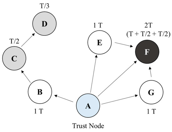For example, node D obtains an authentication level of T/3, because it receives authentication from node C at a distance of three hops from trust node A. If a node receives multiple authentications from neighboring nodes in a distributed network environment, the authentication level is determined based on the sum of the multiple authentication results. For example, according to Figure 3, client nodes E and G have a trust level of 1 T. Node F receives an authentication level of T from trust node A and an authentication level of T/2 from neighboring nodes E and G. Therefore, the level of node F becomes 2 T (=1 T + T/2 + T/2).
