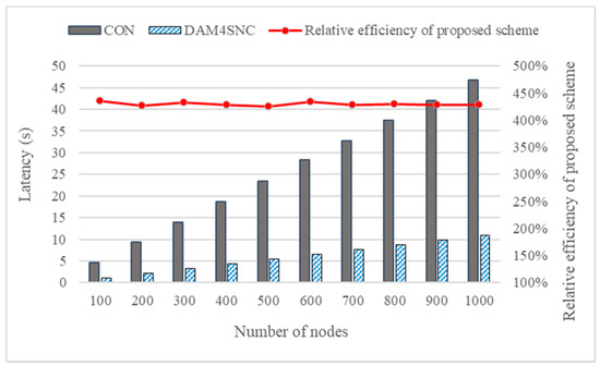 The comparison results of the latency, when increasing the number of nodes in the connected network from 100 to 1000 in batches of 100 units, are shown in Figure 5. Considering Figure 5, the relative latency performance of the proposed scheme is calculated based on the formula below: