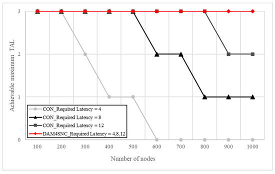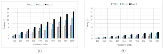 Considering Figure 6a,b, the TALs of the conventional and DAM4SNC models are expressed as TALs 1–3. It was assumed that TALs 1–3 require 2-, 5-, and 10-factor authentications, respectively. Where the number of nodes was 1000, the average latencies of the conventional model with the TAL1 to 3 were 7.20, 11.01, and 14.51 s, respectively. On the other hand, only short average latencies of 1.33, 2.79, and 3.48 s were required when the DAM4SNC model was applied.
