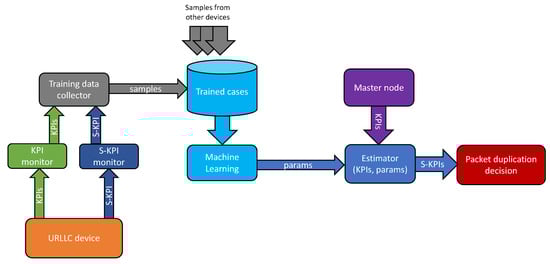 Figure 2 shows the overall architecture of the system. There are three main domains: the device, which contains the sample collection modules; the server, which runs the ML algorithm and stores a dataset with solved trained cases; and the MN, which contains the estimator. The device needs to receive URLLC messages, and therefore KPIs and S-KPI are forwarded to the server, which runs the ML algorithm and is located at the network edge with computational resources and access to a non-restrictive power source.