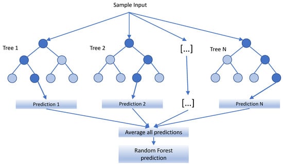 To improve the accuracy, each decision tree output is aggregated. For regression, the aggregation method is typically the average of the output of all the trees. A summarized scheme of the random forests prediction is shown in Figure 3.