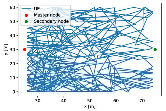 On the other hand, there is a URLLC device that is connected to both gNBs simultaneously, one acting as a MN and the other one as a SN. The initial position of the URLLC device is random over the scenario, using a uniform distribution. Then, when the simulation begins, the URLLC device selects a random direction (where all angles are equiprobable, since a uniform distribution is used) over 360 degrees and maintains that direction during 10 s with a speed of 2 m/s.