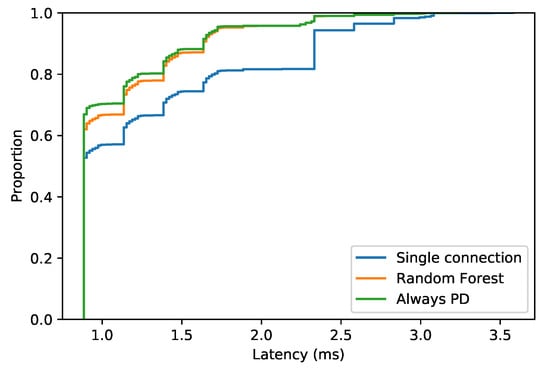 Figure 6 shows the empirical cumulative distribution function (ECDF) of the latency obtained when PD is not used (single connection), when always duplicating the packet and when activating PD based on the latency prediction using Random Forest, which is the system proposed in this paper. First of all, as it can be seen, the random forest and always PD distributions are similar, and they converge at 1.75 ms. The probability of receiving lower values of latency (below 1 ms) is 70%, 62% and 55% for always PD, random forest and single connection, respectively. There is a remarkable difference on the probability of receiving a latency below 2 ms between both PD methods and by transmitting via single connection. In this case, there is a gap of 20% on the probability.