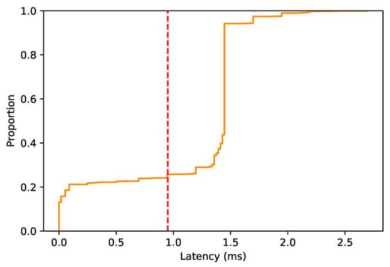 The latency gain distribution when PD is activated by the prediction model is shown in Figure 7. The distribution shows that, when the estimator predicts that latency will be higher than the threshold, in general, there is a latency gain compared to sending over a single link. The latency gain helps to improve the reliability of URLLC communications. The vertical dashed line represents the 75% percentile. In this case, the probability of reducing the latency more than 1 ms is 75%. Otherwise, the probability of not reducing the latency so far, that is, between 0.1 and 0.2 ms, is below 20%.