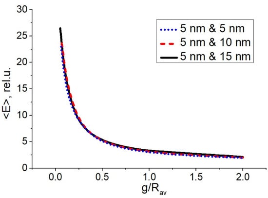 Dependence of the average electric field, <E>, in a gap between two particles on the interparticle gap, g, normalized by the average radius of the particles, Rav. Radius of particles in pairs: 5 nm and 5 nm, 5 nm and 10 nm, 5 nm and 15 nm.