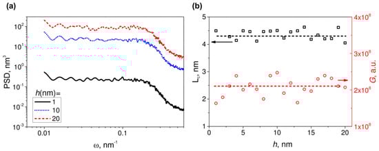 To reveal the correlation between the shape of the PSD function, Raman enhancement and the parameters of an ensemble of hemispheroidal nanoparticles, we modeled sets of different ensembles. First, we investigated the influence of the nanoparticles’ height on the PSD. We considered the ensembles with the same number (N = 1000), the average radius ( = 10 nm) and the radius dispersion (σ = 2 nm) of nanoparticles but different heights. Note, the height of the particles changed from ensemble to ensemble, while all the particles in the ensemble were of the same height. In Figure 3a we present obtained PSD functions calculated for three different heights h, and Figure 3b shows the correlation length, Lc, calculated from the PSD functions of modeled structures and Raman signal in an arbitrary scale, G, versus the height of the structures.