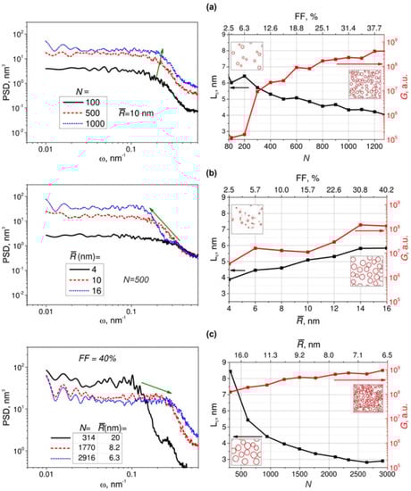 Next, we studied the influence of the spatial distribution of nanoparticles on the shape of PSD function and Raman signal. We considered the ensembles with the nanoparticles of the same height (h = 10 nm) and radius dispersion (σ = 2 nm) but varied the average radius and the number of nanoparticles. We carried out three series of computation: with fixed and variable N; with fixed N and variable ; and with both N and being variable, but keeping the fill factor, FF (see Equation (6)), of the film constant. In Figure 4 we present the results of this modeling and examples of spatial distributions of particles obtained in these simulations (only limiting cases).