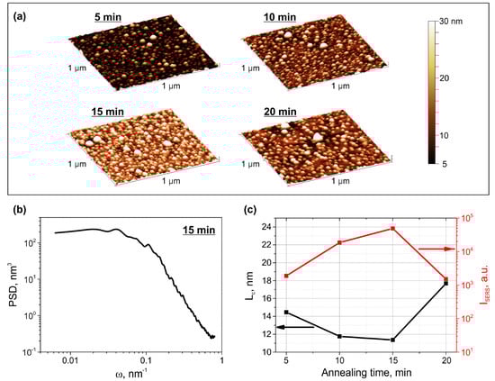 (a) AFM images of SNF formed at different annealing time (denoted). (b) PSD function of the AFM image of the 15-min sample. (c) The dependencies of integral intensity of 1200 cm−1 BPE Raman peak enhanced by SNFs (right axis, red curve) and SNFs’ correlation length (left axis, black curve) on the annealing time.