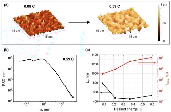 To verify the applicability of the correlation length for defining the SERS efficiency in the case of nanostructures different from nanoparticles, we analyzed 1D PSD functions and SERS-activity of silver dendrites formed in the glass via electrolysis with different passed charge (see Section 2.3 for details). The typical AFM images of the glass surface with the dendrites are presented in Figure 6a. From the images presented it is clear that the surface morphology varied depending on the passed charge: dendrite spikes become noticeably higher when passed charge increases from 0.08 C (left image) to 0.59 C (right image). In Figure 6b we present a PSD function of dendrites formed after passing 0.59 C. As discussed above this was obtained via superimposing of PSD functions based on AFM and optical profilometer. The PSD function is significantly shifted to lower frequencies comparing to one of the SNF (Figure 5b). This is because dendritic structures are significantly larger than the particles in the island film: microns vs. tens of nm. In Figure 6c we demonstrate the dependencies of the integral intensity of 1200 cm−1 BPE Raman peak enhanced by dendrites and dendrites’ correlation length on the passed charge.