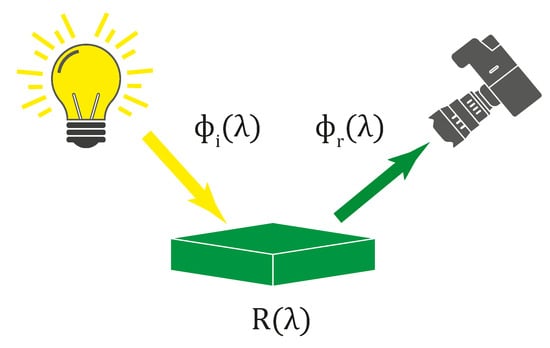 All the influences mentioned above affect the final parameters of photograph prints. Although the dye- and pigment-based colors in the printed photograph may appear similar, their spectral characteristics may significantly vary. Measuring the simple spectral signature of a single spatial point of the print, standard spectroscopy techniques can be used. However, aiming for a more complex ink spectral analysis across the whole printed image, the hyperspectral imaging tool can be exploited. Assume a printed photograph, either dye- or pigment-based, subjected to a source of radiation. Such radiation then may be absorbed, transmitted, or reflected from the photograph. For the spectral measurement, the amount of reflected light captured by the HS camera is the most critical parameter. Let an illumination with defined spectral characteristics be described as incident flux on the object, where represents the spectral wavelength. Similarly, assume a flux reflected from the object defined as . The reflectance then may be expressed as: