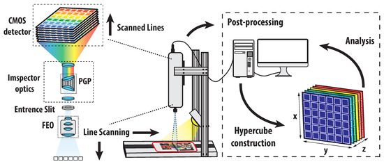 The dye- and pigment-based prints were scanned by the hyperspectral camera SPECIM PFD4K-65-V10E. This camera type is based on the pushbroom line scanning principle. The scanned object was placed on the movable table under the fore camera optics. The table was then illuminated by the halogen lamp connected to the whole table setup. After adjusting the suitable movement speed of the table, the moving object was scanned line by line until the full scan was finished. During the scanning process, each scanned line or, more precisely, each pixel was decomposed into the whole spectral range of the camera. For this purpose, some dispersion components such as prisms, diffraction grating, or their combination were used among the camera internal parts. The full hyperspectral scan was then digitally processed, and the hypercube with all merged hyperspectral lines was constructed. The whole scanning principle is outlined in Figure 3.
