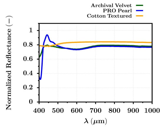 The reflected spectral signature in the VNIR spectral range for the three different blank photo papers extracted from their HS image (FOMEI Archival Velvet, FOMEI PRO Pearl, and FOMEI Cotton Textured).