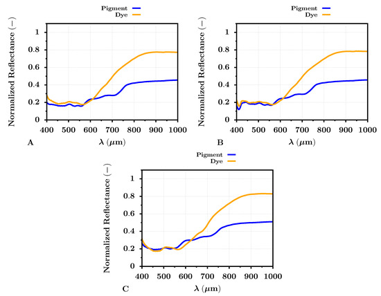 Average VNIR band reflectance of dye- (orange) and pigment-based (blue) test image prints regarding the Archival Velvet (A), PRO Pearl (B), and Cotton Textured (C) photo papers.