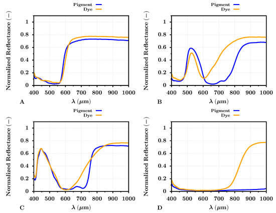 Dye- vs. pigment-based reflectance comparison for the specific color selection.