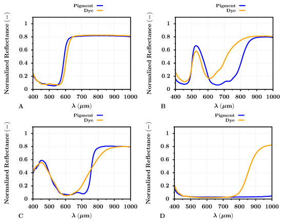 Average color VNIR band reflectance of dye- (orange) and pigment-based (blue) prints on the Cotton Textured inkjet art paper. The letters (A–D) represent colors red, green, blue, and black, respectively.
